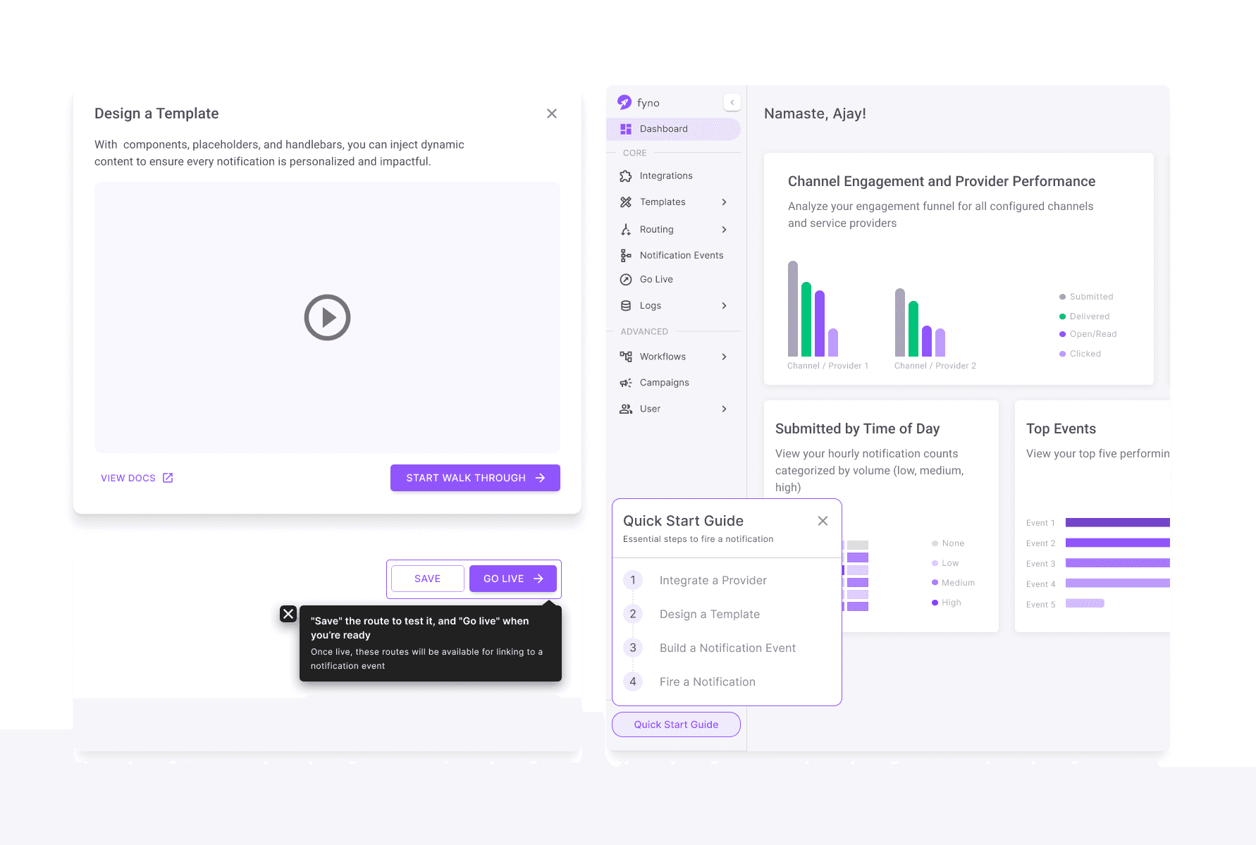 Fyno is a notification infrastructure platform that allows businesses to orchestrate, manage, and monitor messages across multiple channels and providers. Unlike its competitors—who offer one slice of the notification stack—Fyno is an all-in-one ecosystem. That meant the product was powerful, but unfamiliar. Onboarding became a bottleneck. We didn’t prioritize onboarding until the MVP was stable—but by then, user drop-offs and internal hand-holding made it clear we had to design an onboarding flow that didn't just show features, but made sense of the product itself.